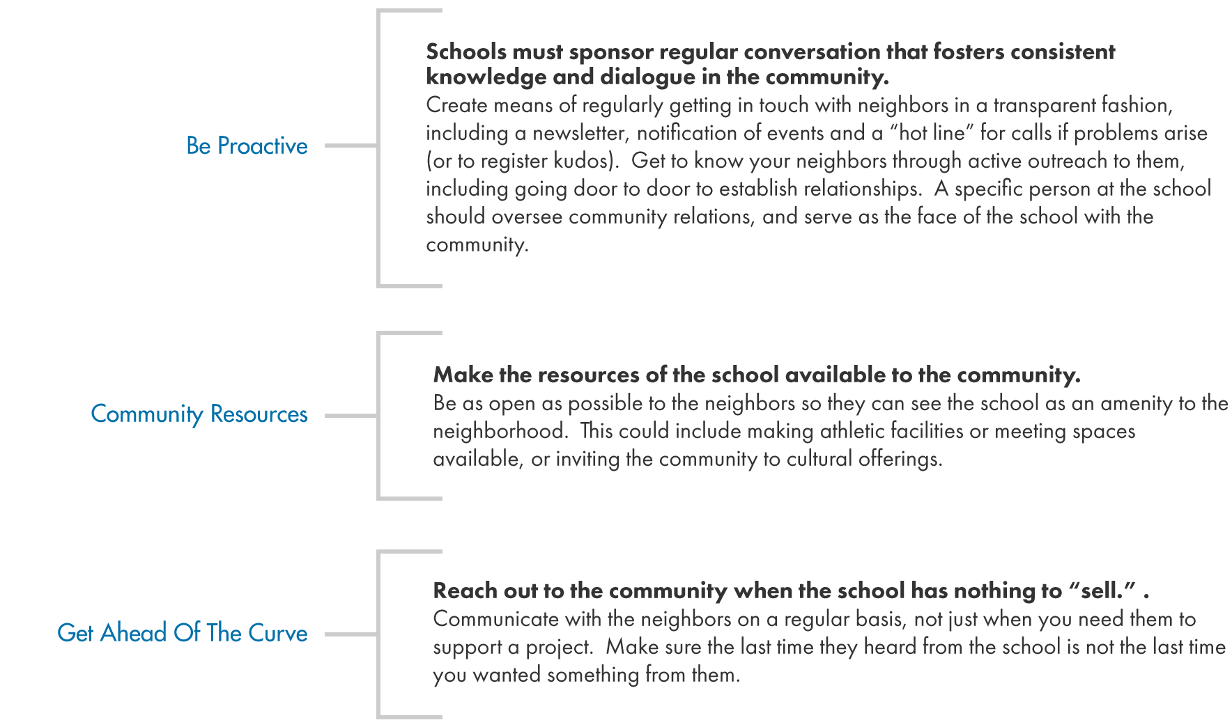 Our symposium panel highlighted ways that independent schools can be both good neighbors and outstanding educational environments. While the daily comings and goings of a vibrant campus can test communities, there are “best practices” that can mitigate these.